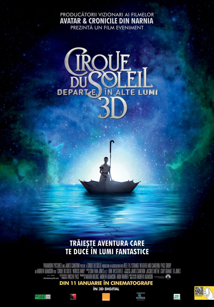 James Cameron, cineastul vizionar, şi regizorul Andrew Adamson (Shrek, Narnia), vă invită împreună cu familia la o aventură 3D unică: CIRQUE DU SOLEIL: DEPARTE, ÎN ALTE LUMI. O tânără şi un tânăr sunt despărţiţi fără voia lor şi trebuie să pornească într-o călătorie prin lumi fantastice pentru a se regăsi. Vom intra în universul de vis, tehnologia 3D ajutându-ne să sărim, să înotăm, să dansăm împreună cu legendarii artişti de la Cirque du Soleil!