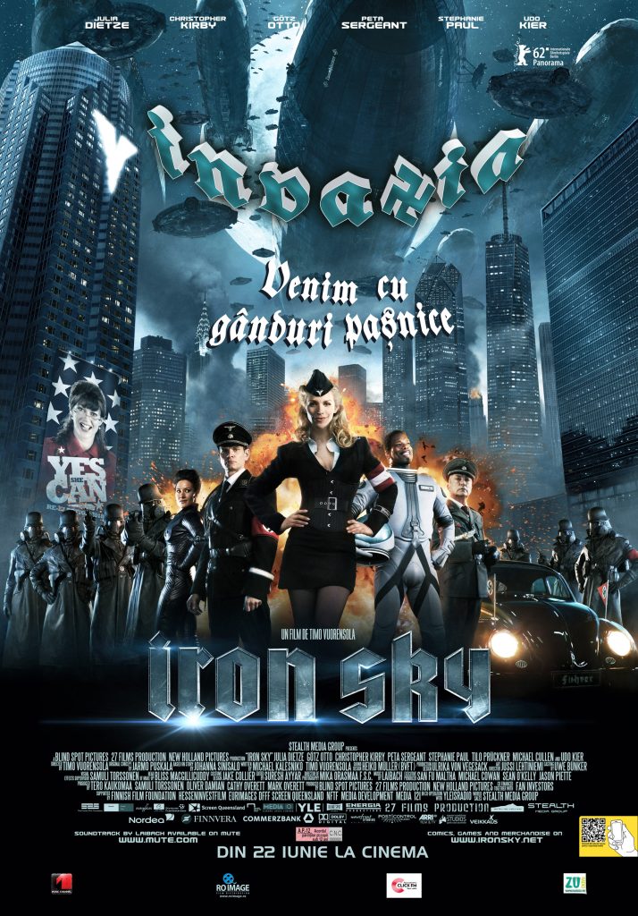 Iron Sky. Invazia este o comedie SF neagră produsă de Blind Spot Pictures şi Energia Productions, din Finlanda, şi co-produsă de 27 Films, din Germania şi New Holland Pictures, din Australia.